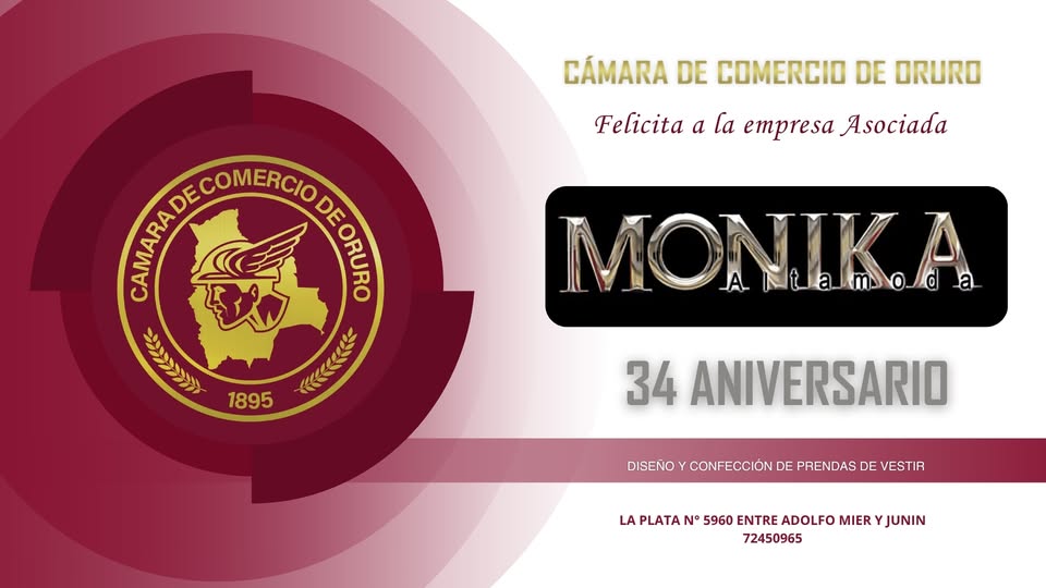 La Cámara de Comercio de Oruro felicita a su empresa asociada 𝐌𝐎𝐍𝐈𝐊𝐀 𝐀𝐥𝐭𝐚 𝐌𝐨𝐝𝐚, por conmemorar 34 años de trayectoria, destacándose en el rubro del diseño y confección de prendas de vestir.